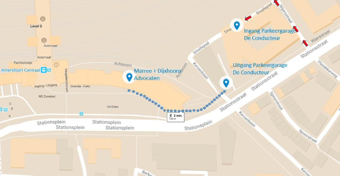 In de parkeergarage kunt u gebruik maken van de parkeerplaatsen voorzien van het logo van Marree + Dijxhoorn of het logo van ‘De Conducteur’. Vervolgens kunt u de bordjes ‘De Conducteur’ aanhouden richting de hoofdingang van het Centraal Station. De ingang van het kantorencomplex treft u ruim vóór de hoofdingang van het Centraal Station aan uw rechterzijde aan.